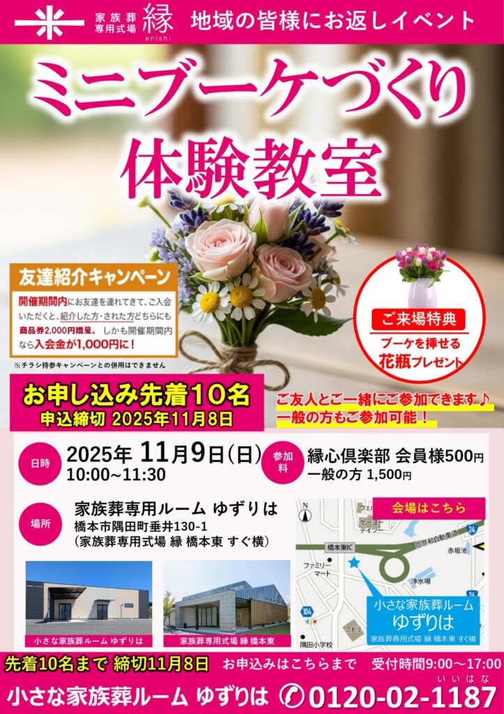 「橋本市で開催|小さな家族葬ルームゆずりはのミニブーケづくり体験教室(11月9日)」