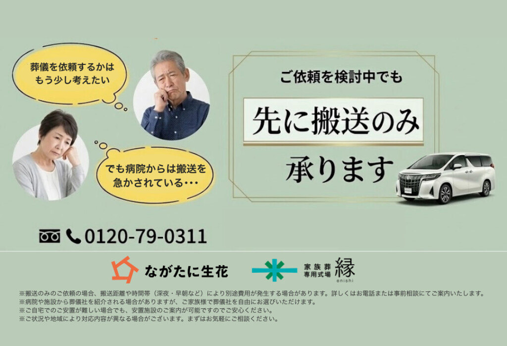 ※搬送のみのご依頼の場合、搬送距離や時間帯(深夜・早朝など)により別途費用が発生する場合があります。詳しくはお電話または事前相談にてご案内いたします。